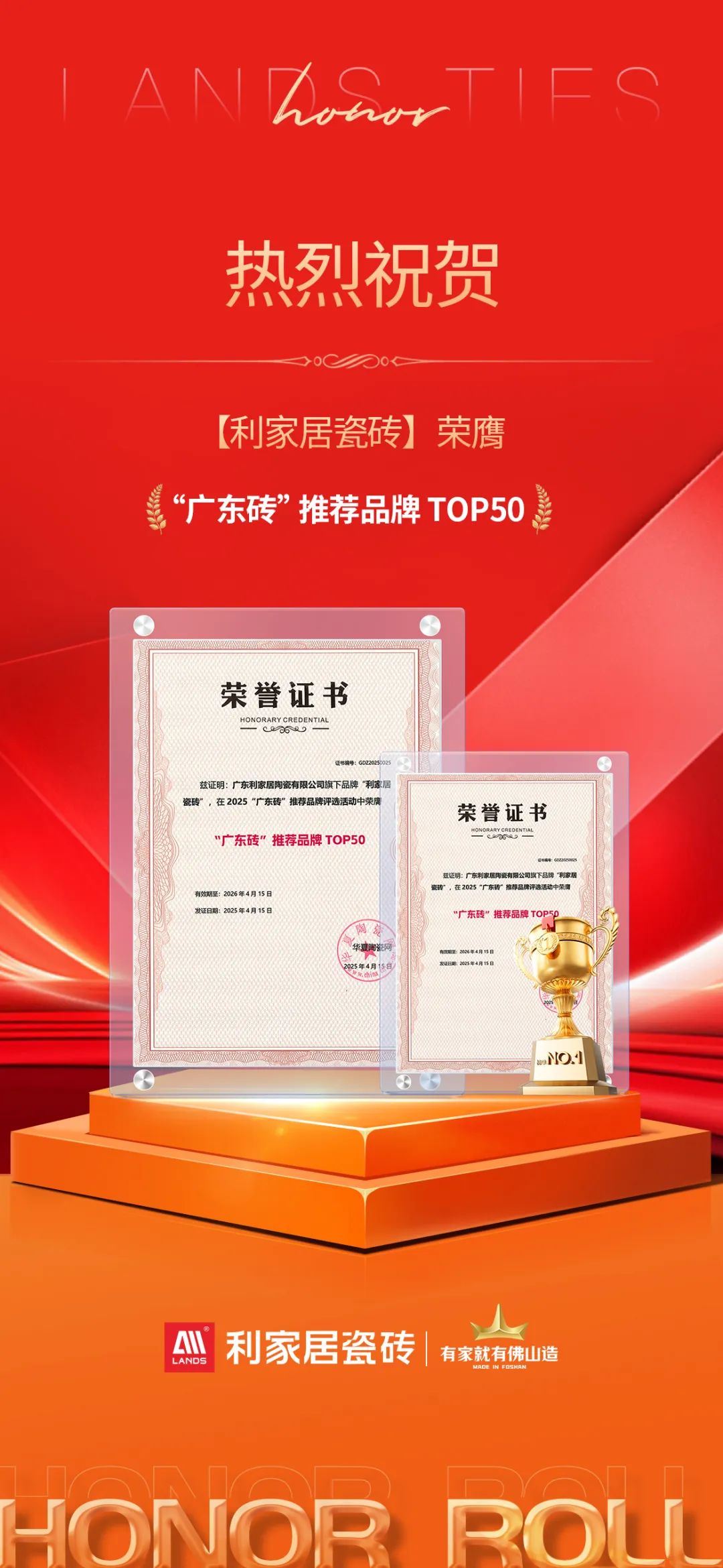4月15日,2025年陶瓷行业高质量发展峰会暨“广东砖”推荐品牌TOP50榜单发布仪式在佛山隆重举办。此次活动由广东陶瓷协会指导,华夏陶瓷网主办,以“擦亮‘产业地标’”这一主题,汇聚了众多行业专家与企业代表齐聚一堂,围绕“广东砖”高质量发展的标准、方向及路径展开深入探讨。